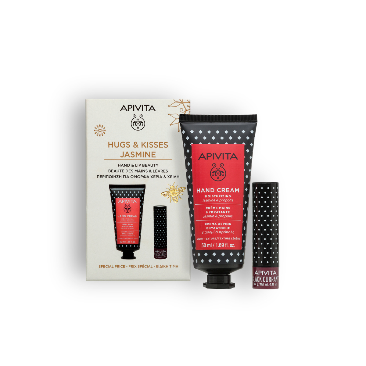 Ovaj Apivita set kombinira bogatu njegu ruku i usana. Ovaj set kombinira hidratantnu kremu za ruke s jasminom i propolisom I balzam za usne s crnim ribizlom (rijebesom) njeguje i štiti usne, daje blagu, prirodnu nijansu te pomaže spriječiti isušivanje. Praktičan duo za torbicu i svakodnevnu upotrebu tijekom cijele godine.