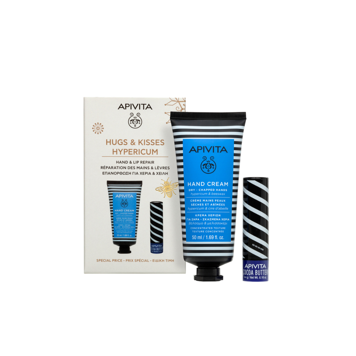 Set za obnovu i zaštitu suhe i oštećene kože ruku i usana. Sadrži Apivita kremu za suhe i oštećene ruke s gospinom travom i pčelinjim voskom (50 ml) te Apivita balzam za usne s kakao maslacem i SPF 20 (4,4 g).