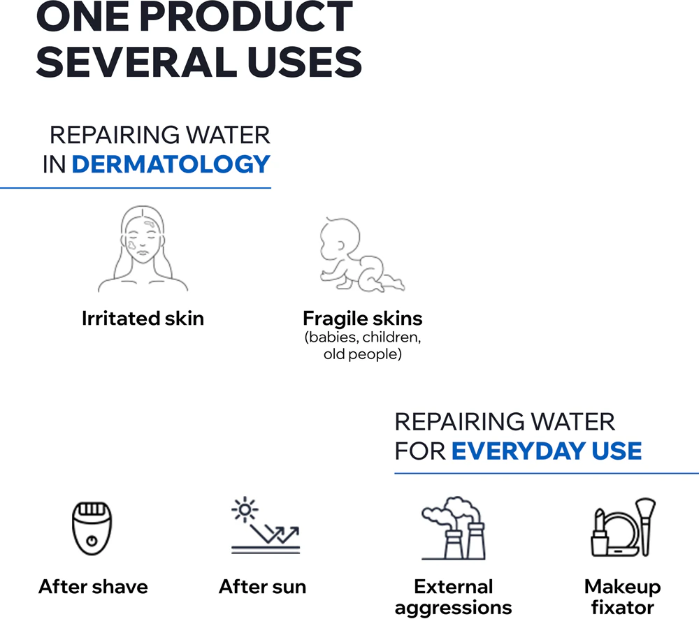 Voda za njegu i osvježenje osjetljive kože lica, tijela i mukoznih membrana, po prirodnom sastavu slična fiziološkoj otopini soli. Bakteriološki čista, prirodno izotonična, vlaži, umiruje, djeluje protuupalno i protiv slobodnih radikala. Umiruje upalne dermatoze (ekcem, crvenilo, iritacije, svrbež, opekline od sunca, seborejički dermatitis). Indikacije u pedijatriji (pelenski osip, prevencija i njega kod alergijskog i nealergijskog dermatitisa, čišćenje sluznice nosa i očiju). Za fiksiranje šminke, nakon depilacije, nakon brijanja.