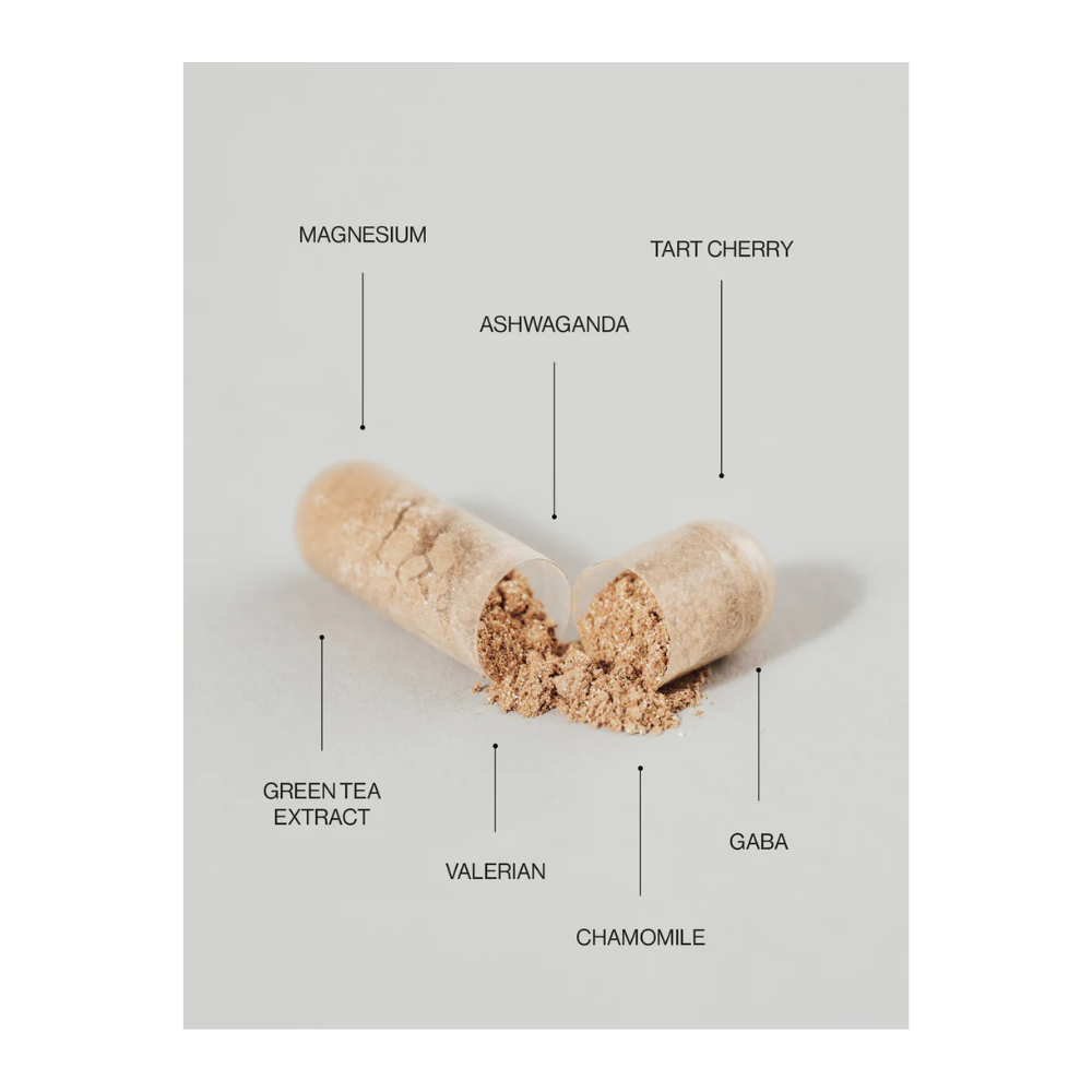 Magnesium malate, chamomile (Matricaria recutita) flower extract, capsule (HPMC – hydroxypropyl methylcellulose), green tea (Camellia sinensis) leaf dry extract, CherryPure® [montmorency tart cherry (Prunus cerasus) fruit powder], ashwagandha (Withania somnifera) root extract, valerian (Valeriana officinalis) root extract, gamma-aminobutyric acid (GABA), anticaking agent (magnesium salts of fatty acids).