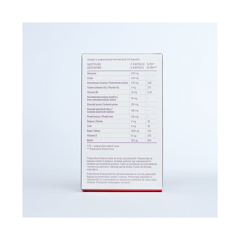 DL-metionin i L-cistin klasificiraju se kao aminokiseline i igraju ulogu u proizvodnji keratina. Vitamini B5, B1, B6 i B10 doprinose rastu kose od korijena prema van, dok su minerali željezo, cink i bakar uključeni u jačanje vaše kose. Ekstrakt prosa, ekstrakt pšeničnih klica i pivski kvasac pružaju potrebnu hranu za prirodnu hidrataciju i sjaj.