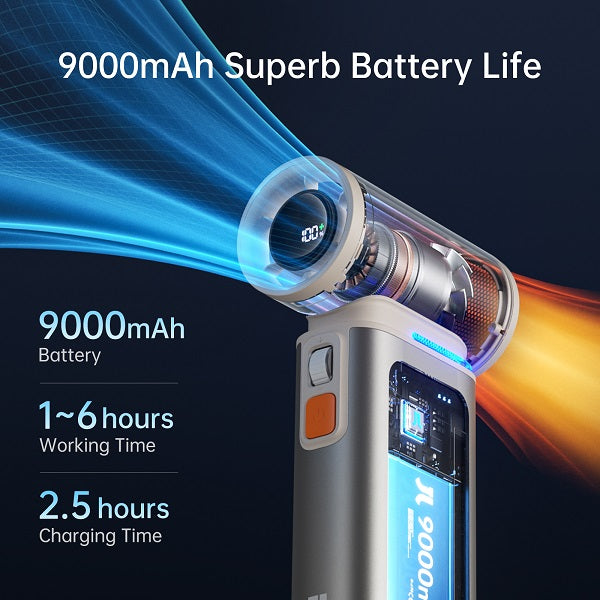 Snažna 90000 mAh baterija osigurava do 6,5 sati rada, ovisno o odabranoj brzini, a ventilator se puni putem USB‑C priključka za samo nekoliko sati. Mogućnost korištenja 4 brzine, uključujući i način rada s prirodnim protokom zraka za maksimalnu udobnost.