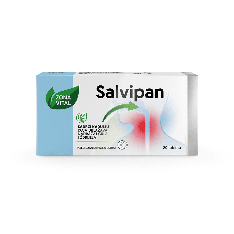 Salvipan tablete za otapanje u ustima su dodatak prehrani koji sadrži suhi ekstrakt lista kadulje, vitamin C i pantotensku kiselinu.