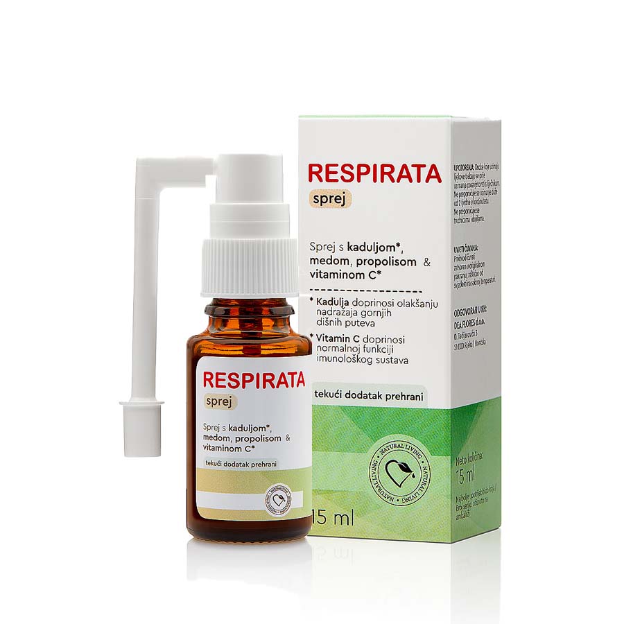 Respirata sprej je tekući dodatak prehrani koji sadrži kadulju koja doprinosi olakšanju nadražaja gornjih dišnih puteva. Osim blagodatne kadulje sadrži i Vitamin C koji doprinosi normalnoj funkciji imunološkog sustava.