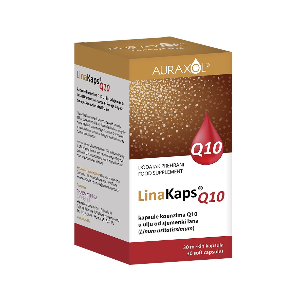 LinaKaps Q10 je dodatak prehrani u obliku mekih uljnih kapsula, a sadrži koenzim Q10 u ulju od sjemenki lana.