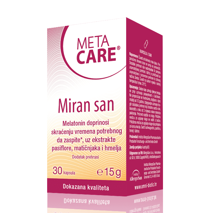 Miran san je od velike važnosti i za organizam i naše psihičko zdravlje. META-CARE® Miran san sadrži ekstrakte biljnih tvari pasiflore, matičnjaka, hmelja, ashwagandhe i šafrana. Melatonin u ovom proizvodu doprinosi skraćenju vremena potrebnog da zaspite. Osim toga, ovaj dodatak prehrani sadrži cink koji doprinosi normalnoj kognitivnoj funkciji i štiti stanice od oksidativnog stresa.