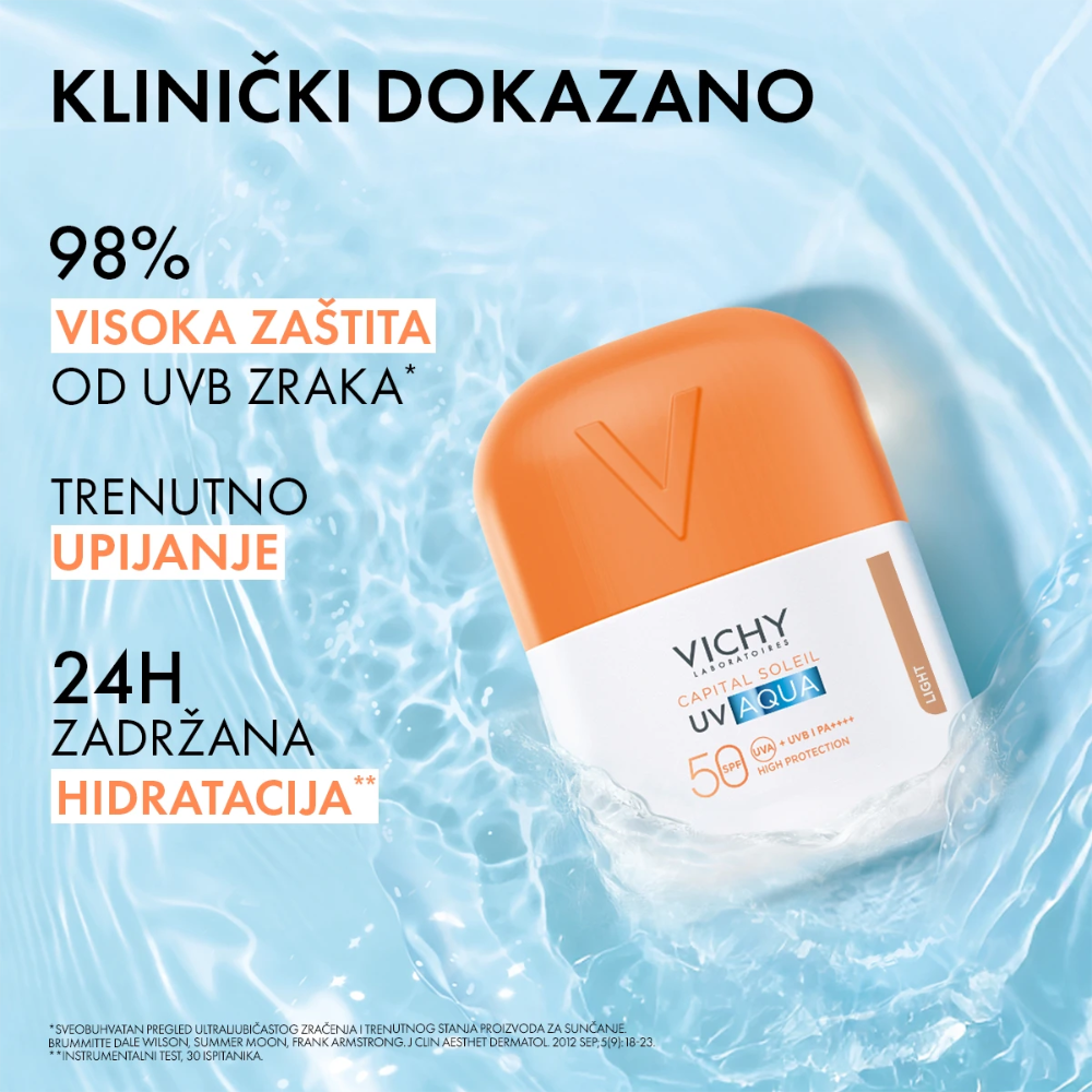 Novi UV AQUA NEVIDLJIVI FLUID SPF 50, hidracijski, svjež, lagano tonirani fluid za lice s naprednom dnevnom UV zaštitom. Ovaj SPF je lagan, svjež i nevidljiv baš poput vode. Zaštita od UVA, UVB zračenja, onečišćenja i oksidacijskog stresa. Pruža dugotrajnu hidraciju u vodenastoj teksturi koja je nevidljiva na svim fototipovima i trenutno se upija. Otporan na vodu, hipoalergen i pogodan za područje oko očiju i kapke. Precizan aplikator za najugodnije iskustvo pri nanošenju. Neodoljiv miris."