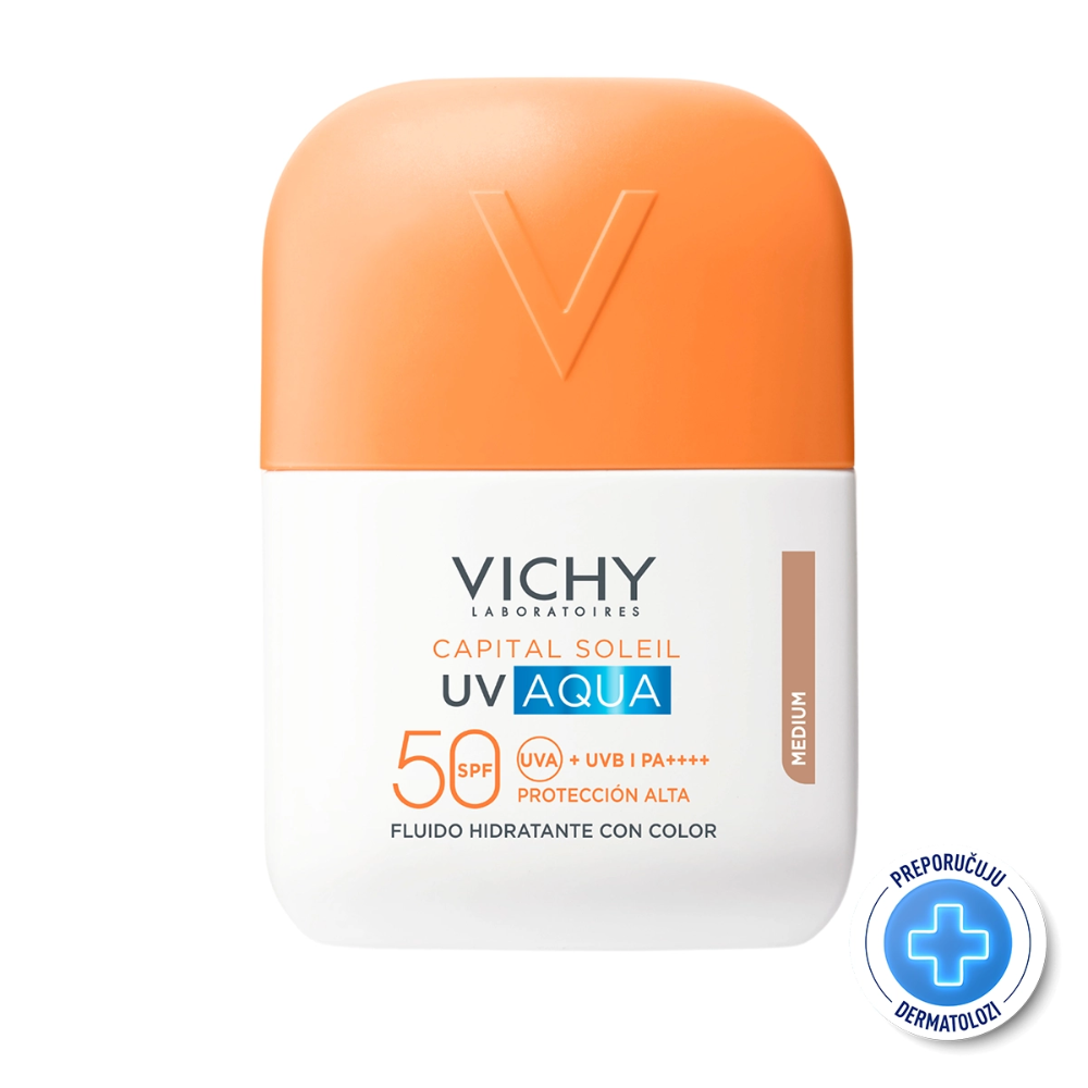 Novi UV AQUA NEVIDLJIVI FLUID SPF 50, hidracijski, svjež, lagano tonirani fluid za lice s naprednom dnevnom UV zaštitom. Ovaj SPF je lagan, svjež i nevidljiv baš poput vode. Zaštita od UVA, UVB zračenja, onečišćenja i oksidacijskog stresa. Pruža dugotrajnu hidraciju u vodenastoj teksturi koja je nevidljiva na svim fototipovima i trenutno se upija. Otporan na vodu, hipoalergen i pogodan za područje oko očiju i kapke. Precizan aplikator za najugodnije iskustvo pri nanošenju. Neodoljiv miris."