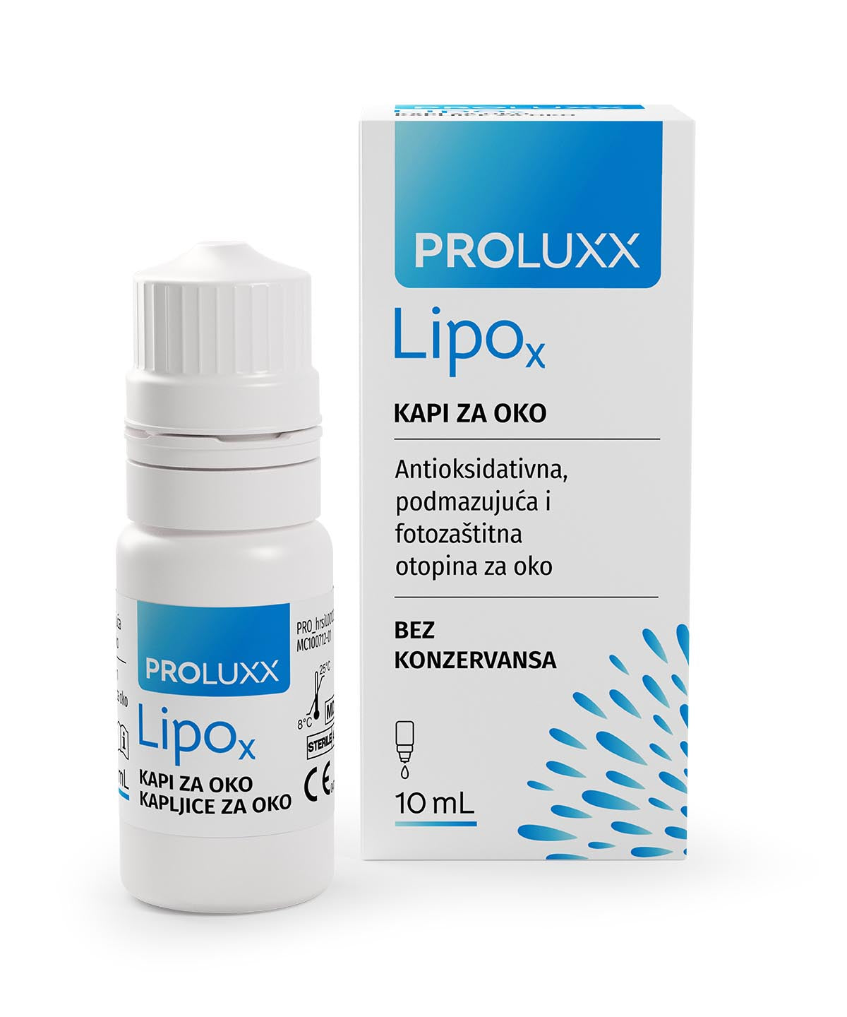 Medicinski proizvod koji umiruje, vlaži i podmazuje suhe oči, posebno kod alergije.Bočica je opremljena je inovativnim APTAR® višedoznim sustavom zatvaranja bočice kojim se sprječava kontaminacija. Formulacija bez konzervansa. Proluxx duo sprej medicinski je proizvod s antioksidativnim, podmazujućim i fotozaštitnim svojstvima namijenjen za simptomatsku terapiju sindroma suhog oka. Nadomješta suze kod stresa za oči uzrokovanog štetnim posljedicama plave svjetlosti, stresa povezanom s okolišem, nakon operacije ili traume oka.