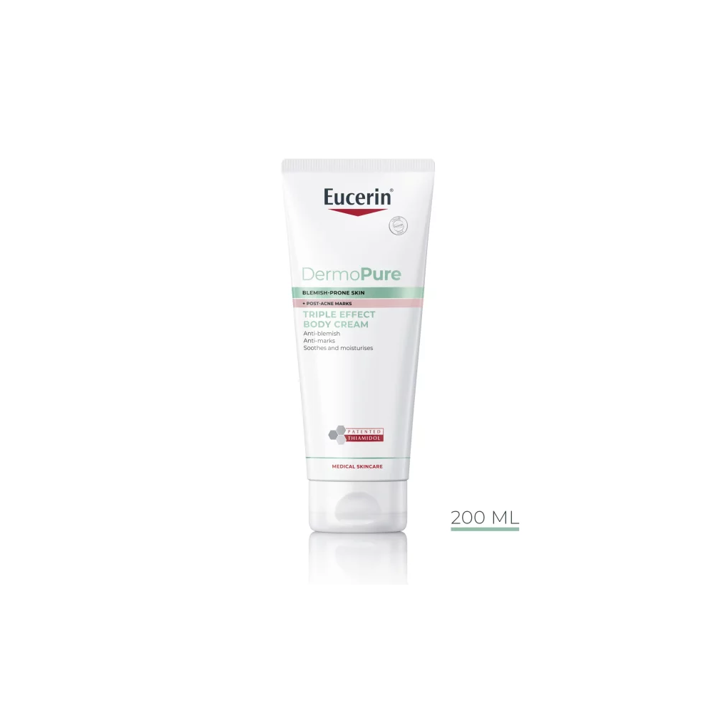 Izloženost suncu dodatno pogoršava ove simptome. Eucerin DermoPure krema za tijelo s trostrukim djelovanjem kombinira učinkovite aktivne sastojke koji smanjuju nečistoće i tragove prištića te istovremeno umiruju i hidriraju kožu: