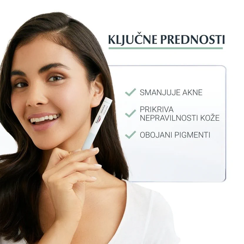 Eucerin DermoPure obojani stik za prikrivanje nepravilnosti kože je korektor koji sadrži salicilnu kiselinu koja dokazano smanjuje i prikriva pojavu prištića i mitesera. Glatko prekriva nepravilnosti i ujednačava kožu te istovremeno smanjuje prištiće i čisti začepljene pore. Obojani stik za prikrivanje se može koristiti u kombinaciji s medicinskim tretmanima, a siguran je za korištenje u trudnoći.